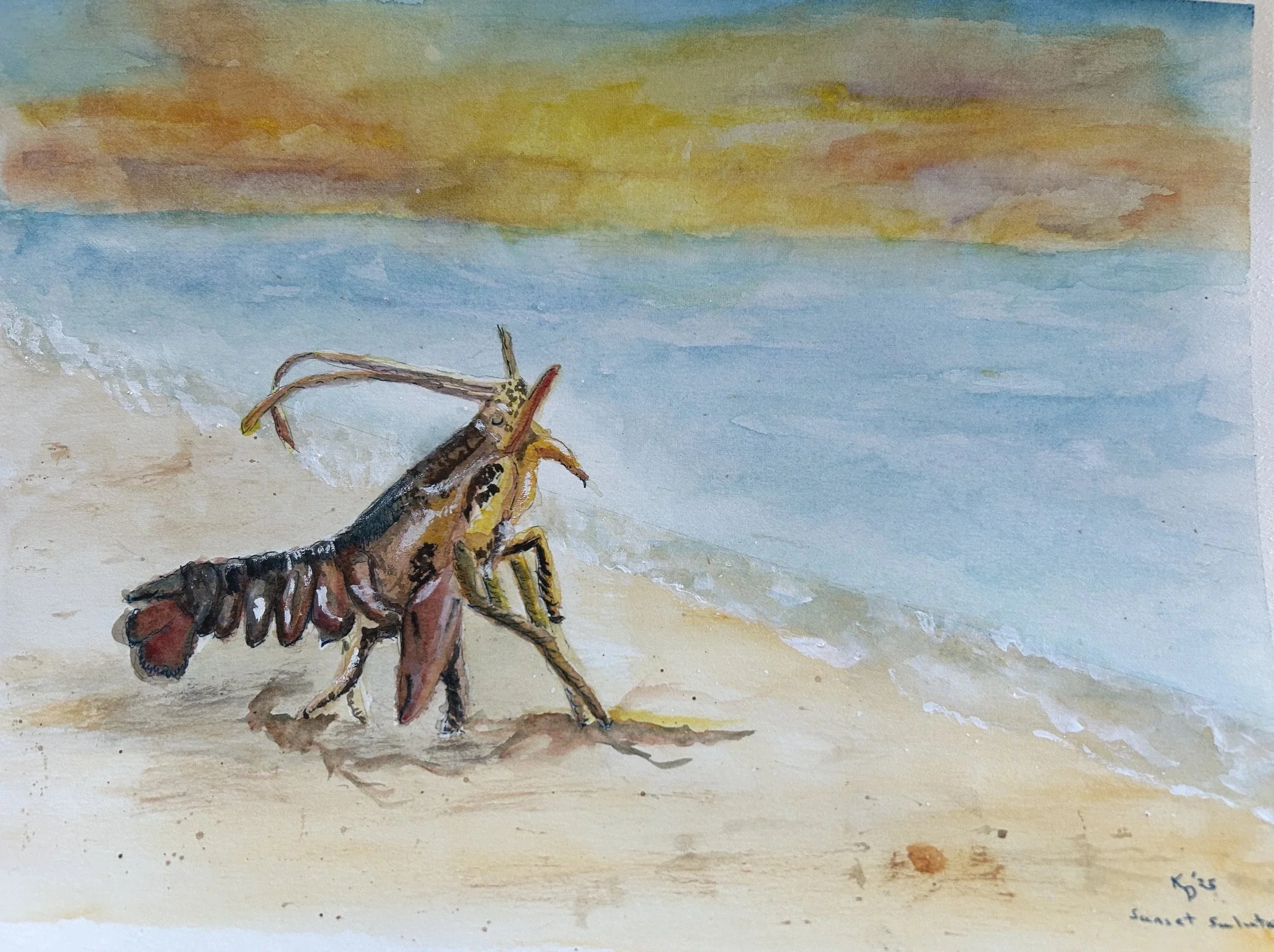 lobster saluting the setting sunset.9 x 12 watercolor original painting by Kari Dalton owner of Spiderwort Studio. Comes with certificate of authenticity.contact us to purchase $100.00 unframedspiderwort.studio@gmail.com