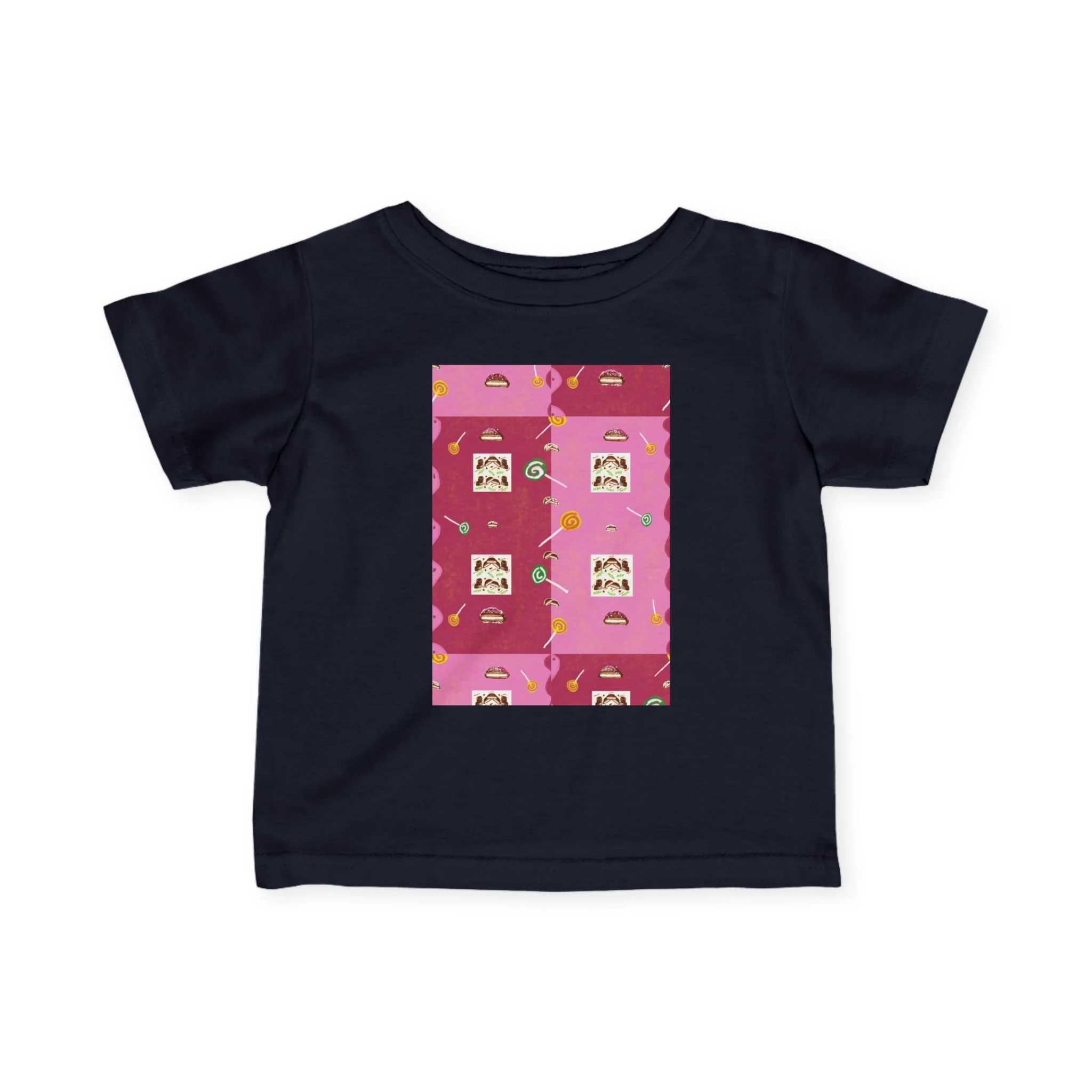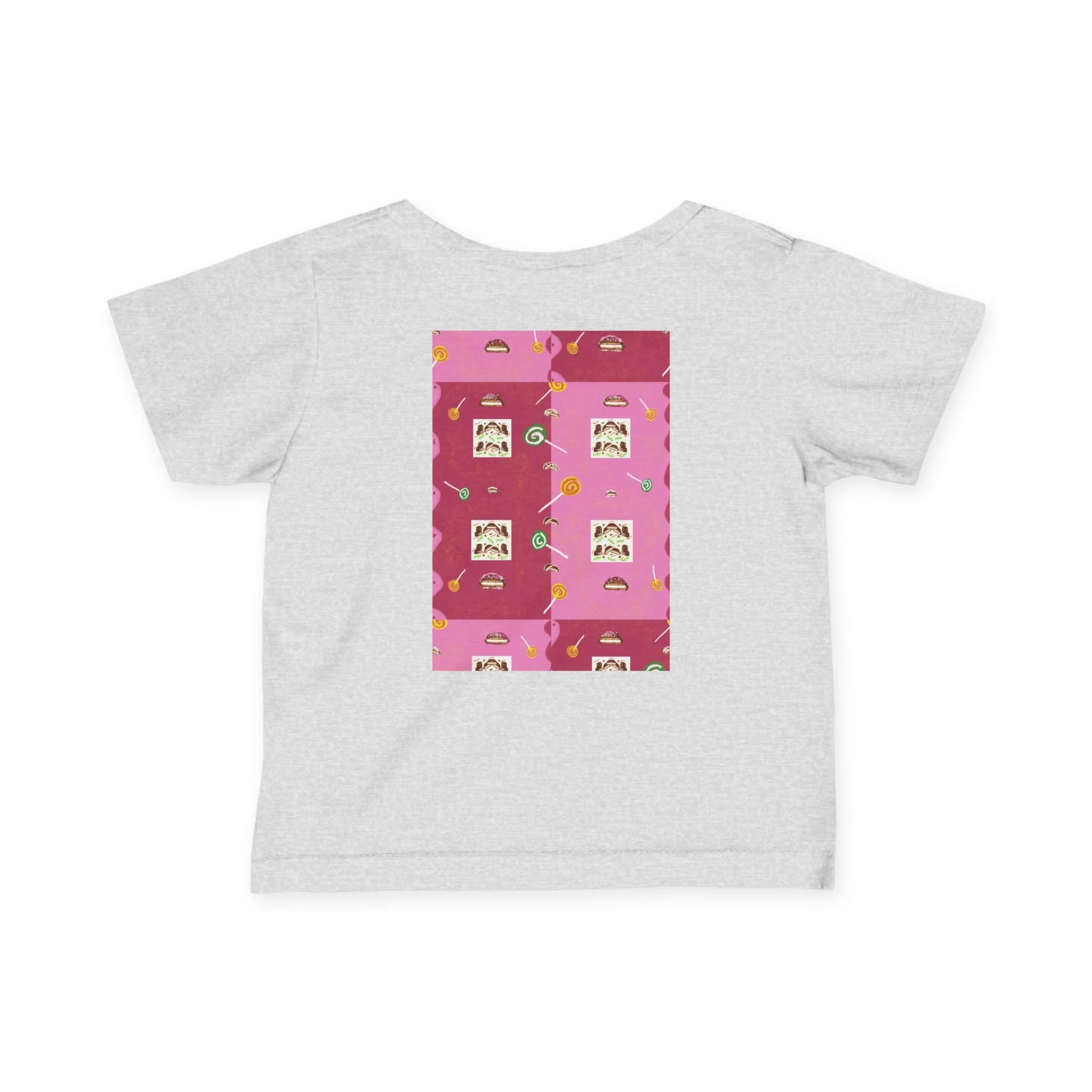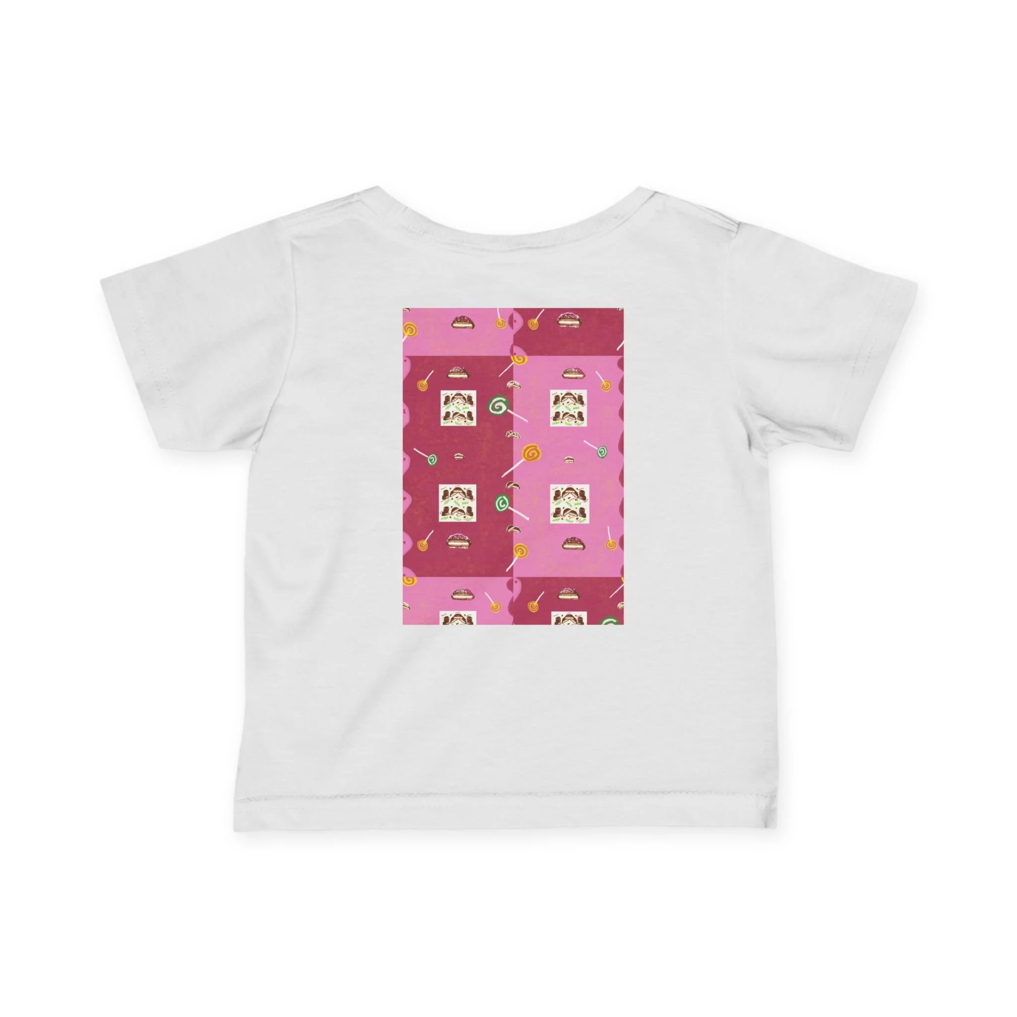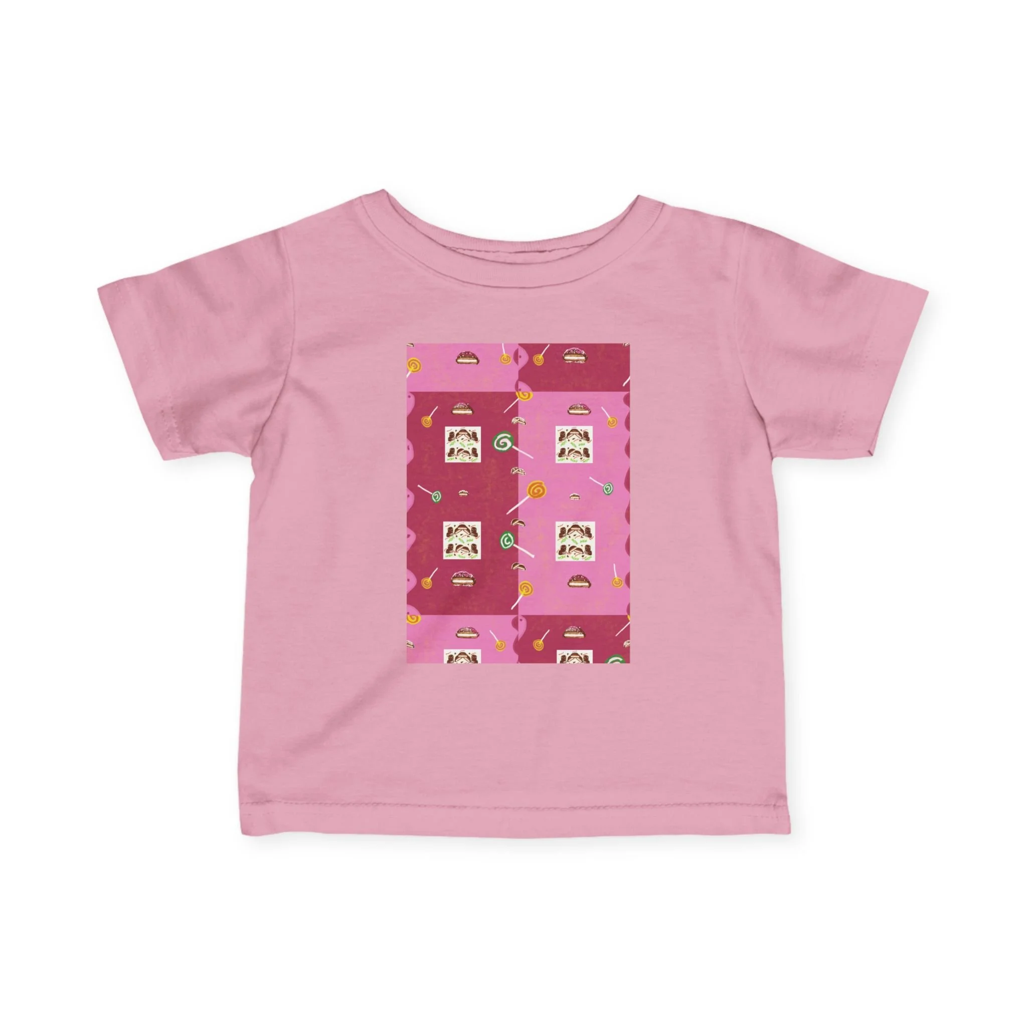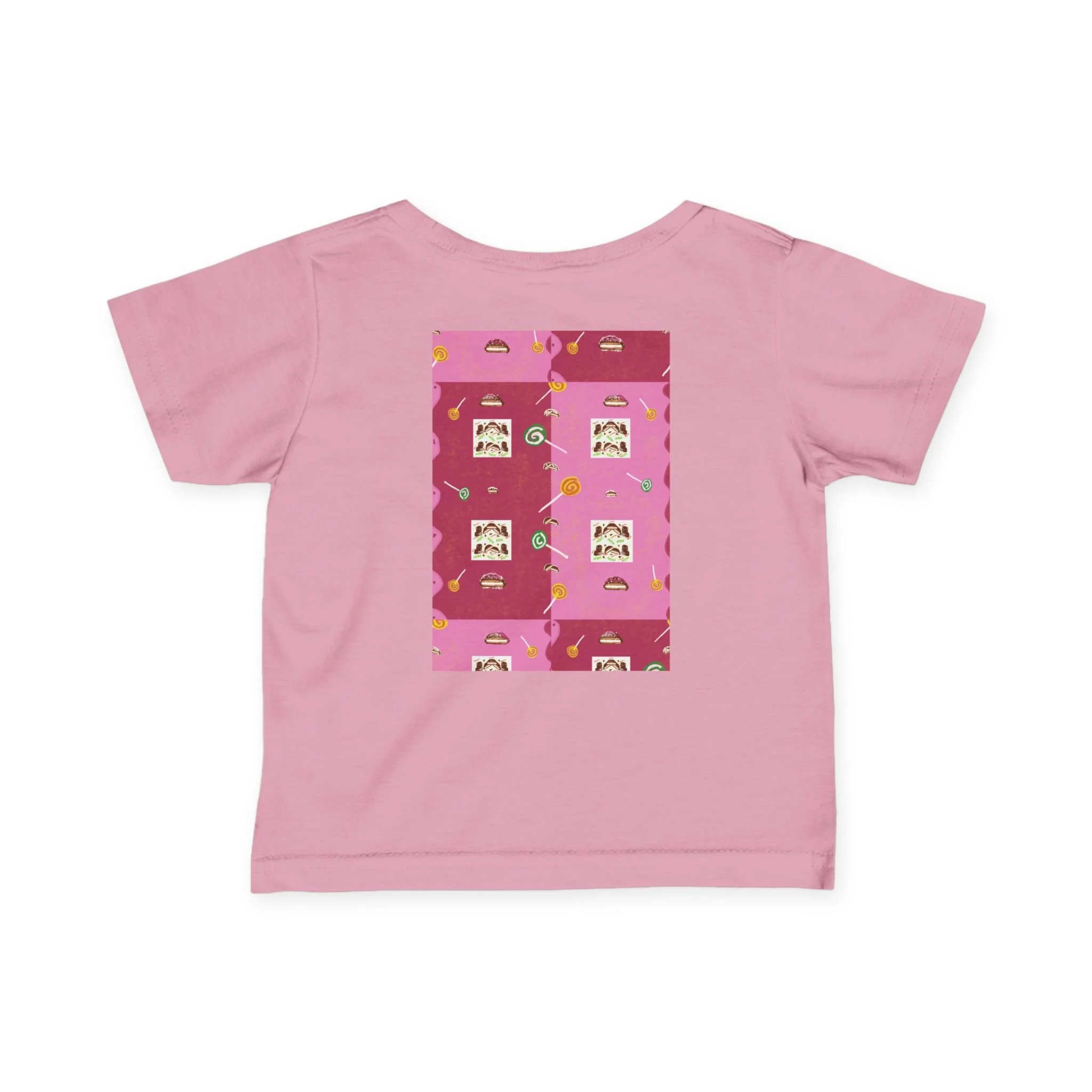 Of of a kind Infant Tee — designed by a grandma. Cute Pink Snack Pattern Baby T‑Shirt (“Yum” Cartoon Treats)
