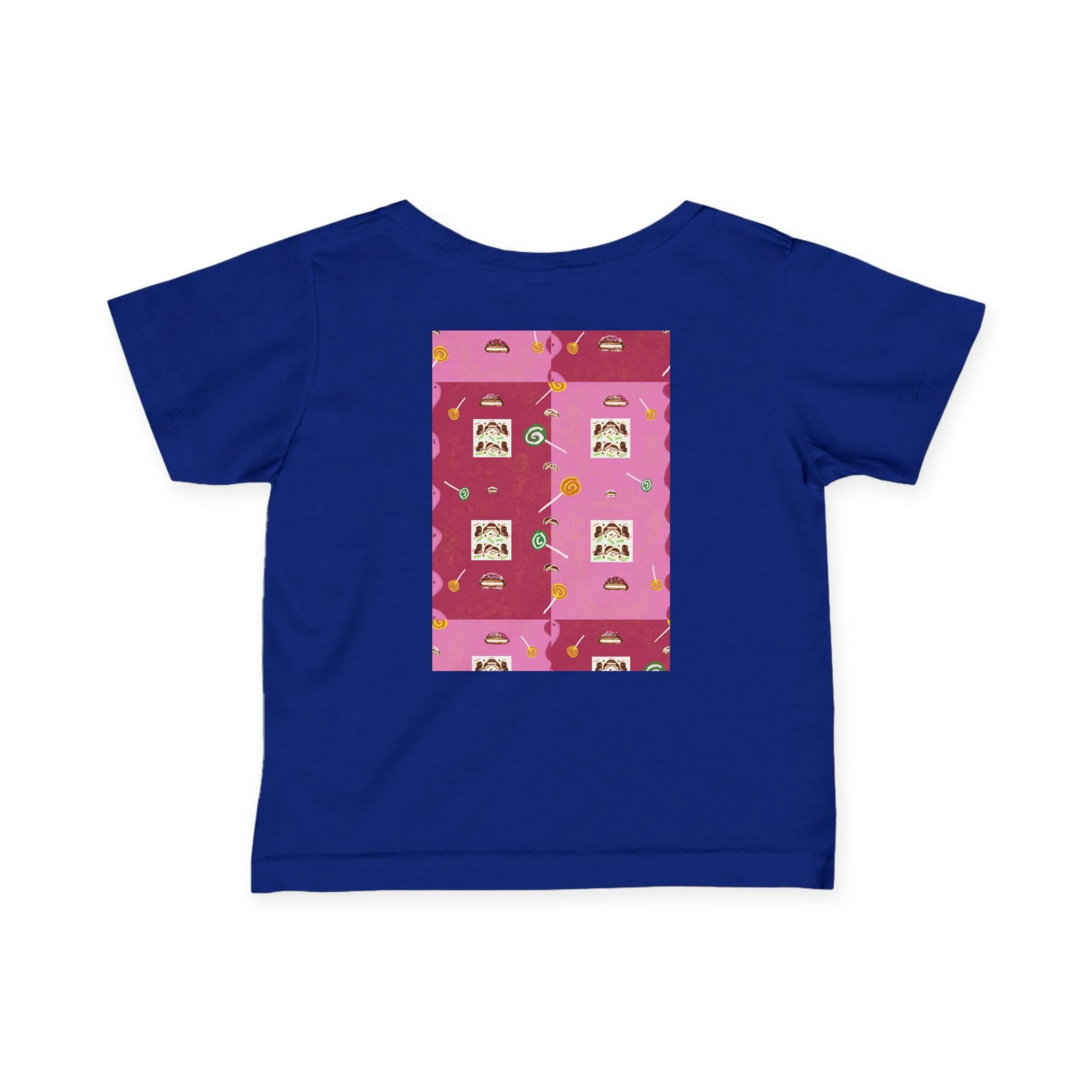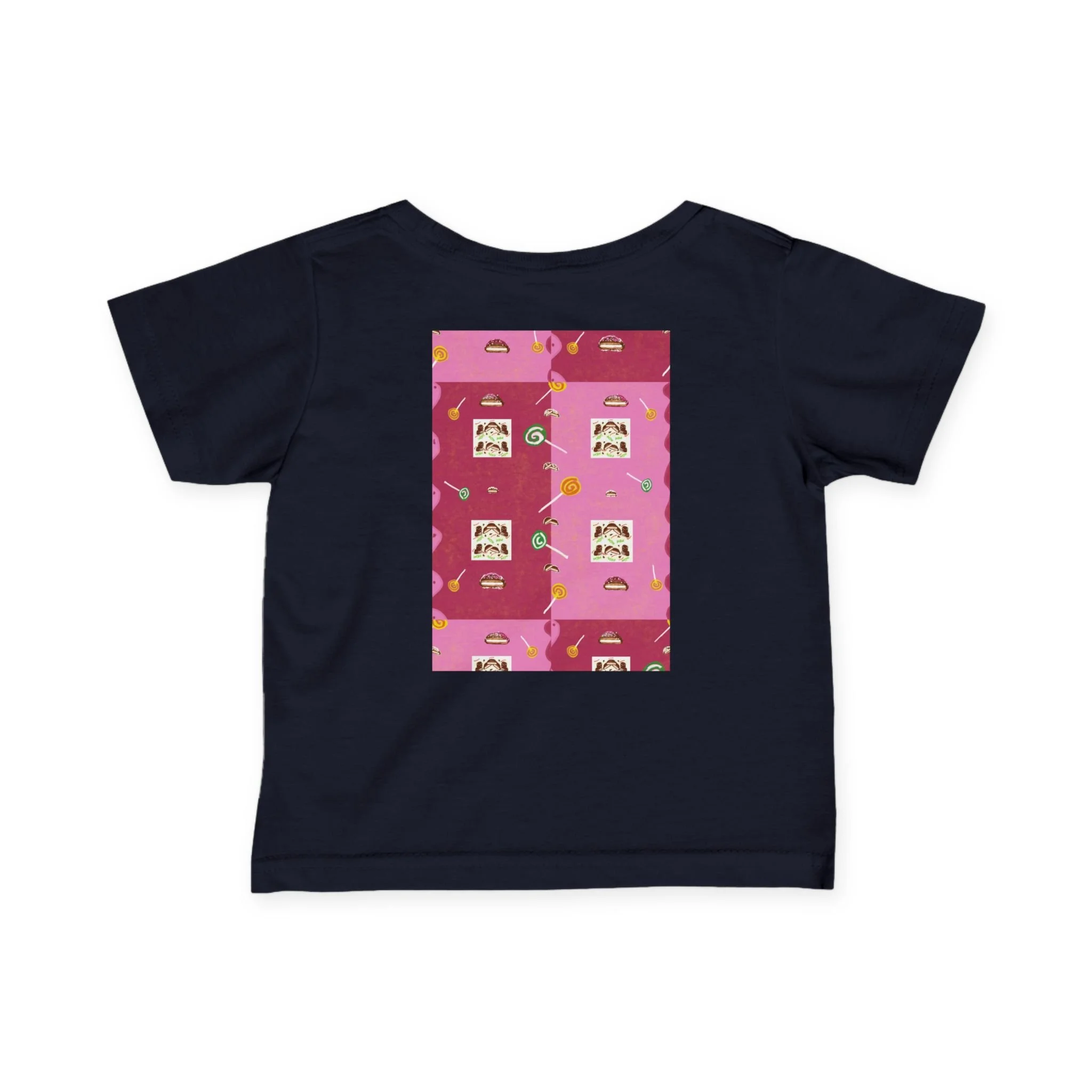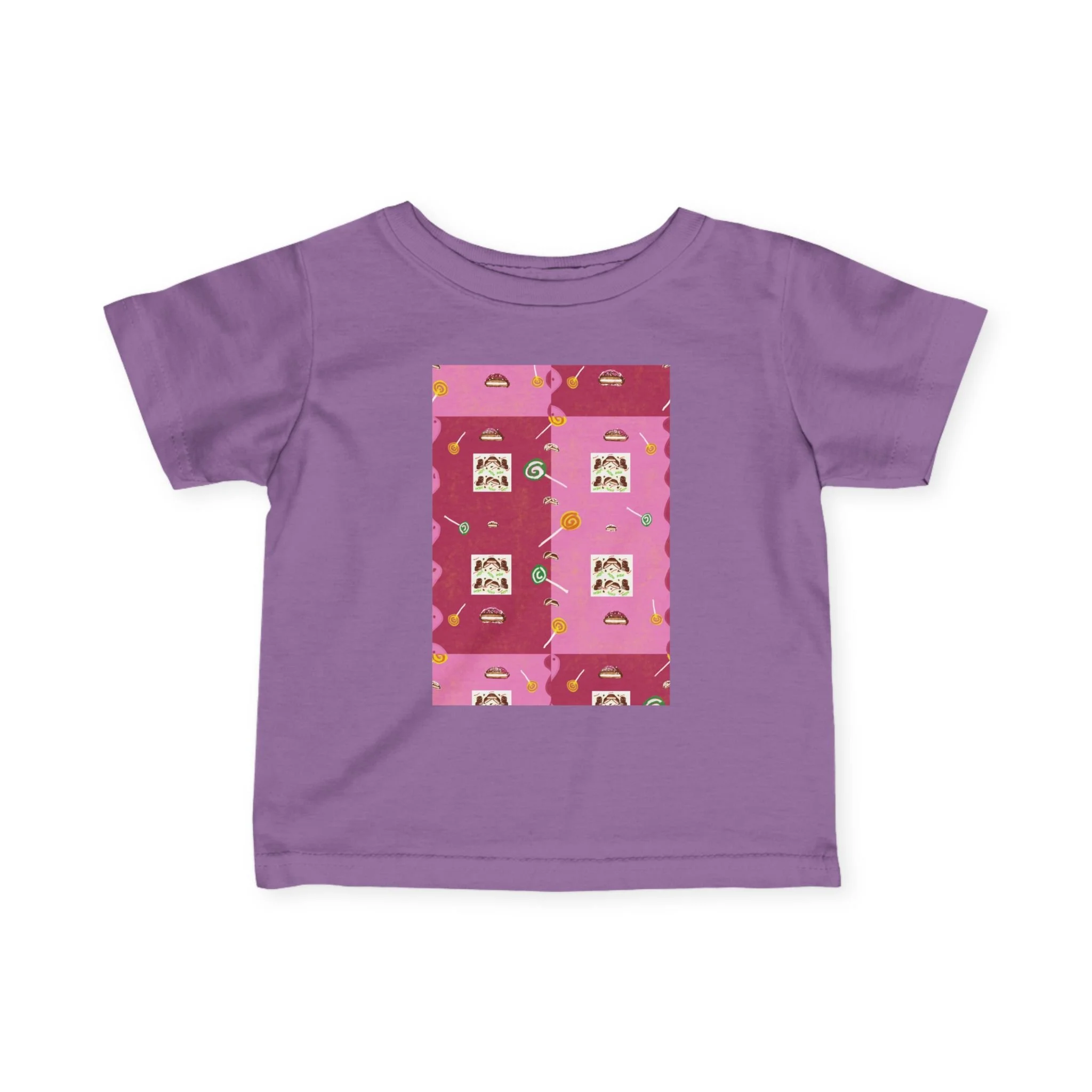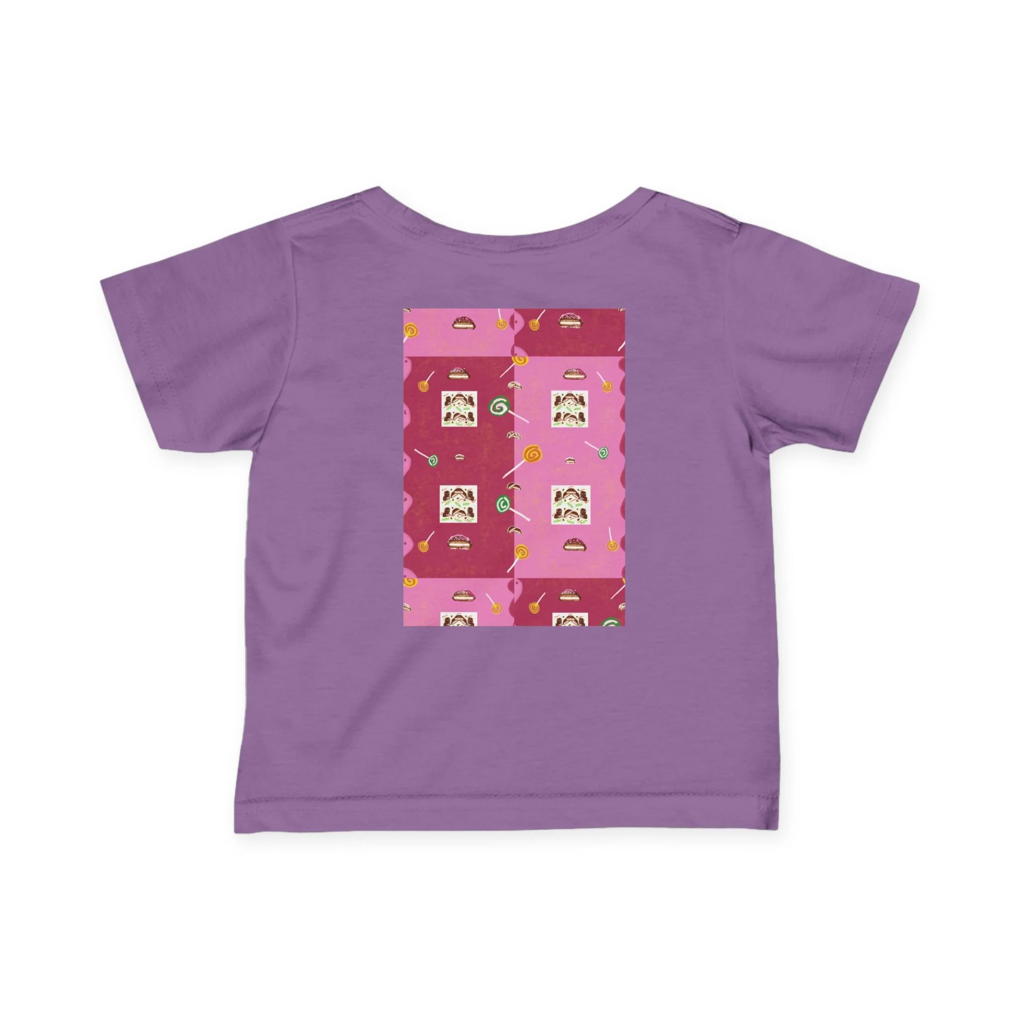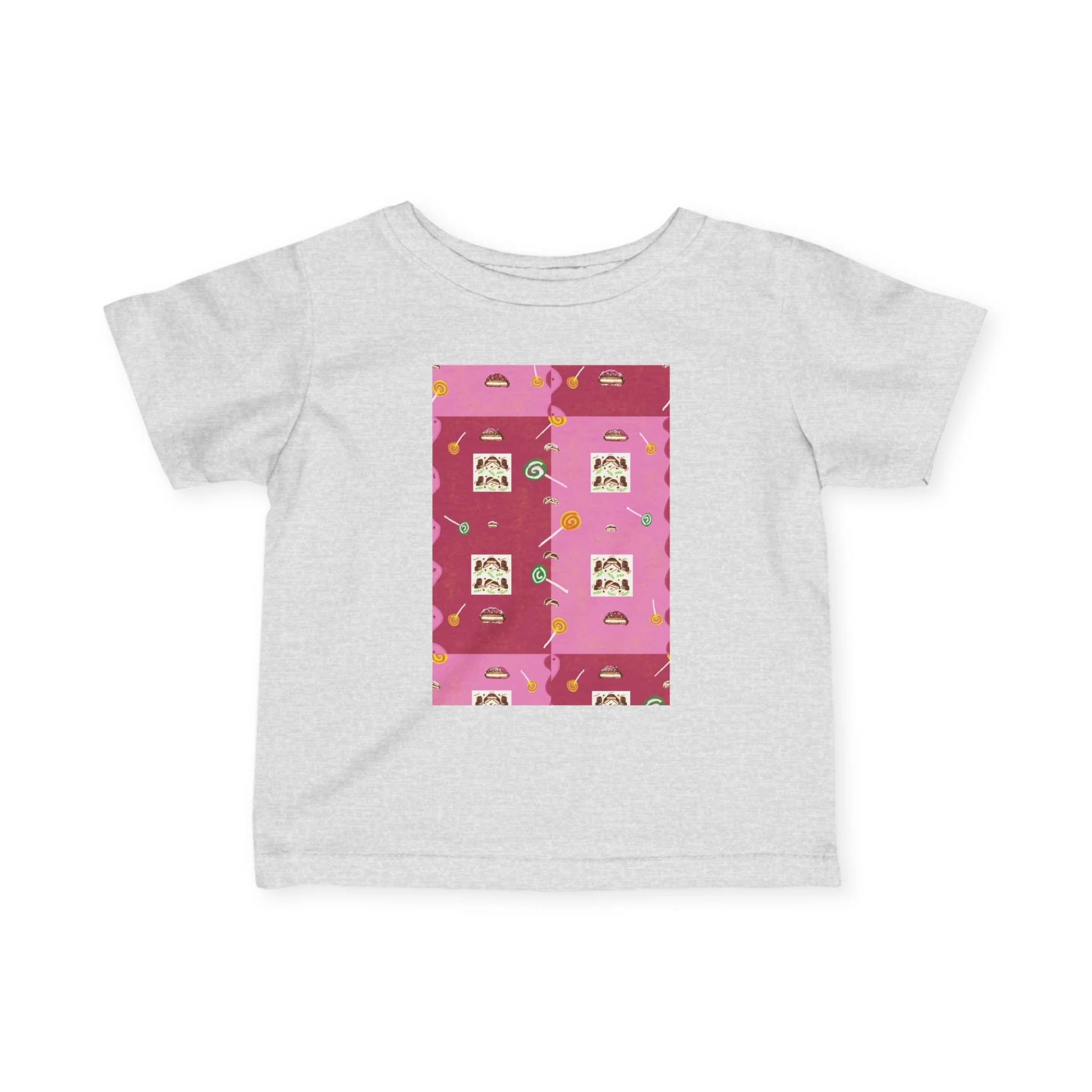 Of of a kind Infant Tee — designed by a grandma. Cute Pink Snack Pattern Baby T‑Shirt (“Yum” Cartoon Treats)